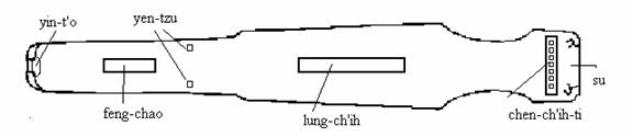the ch'eng-lu, extending up to the bridge, where they hold the strings. The