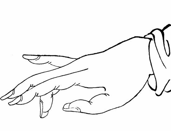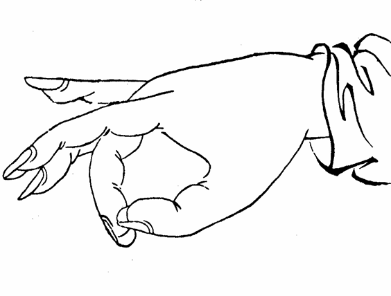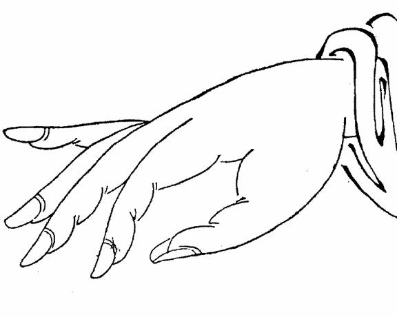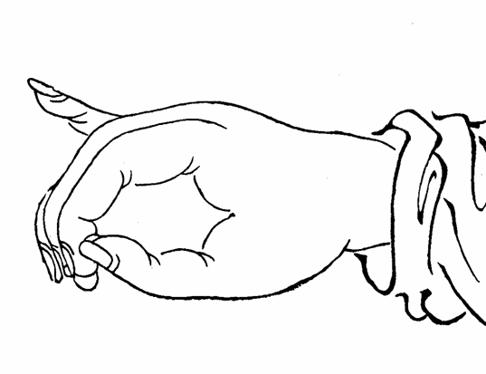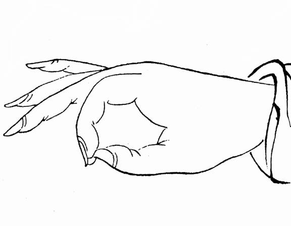 down with its outer two joints and fingernail hanging down. The thumb should be under the index finger
