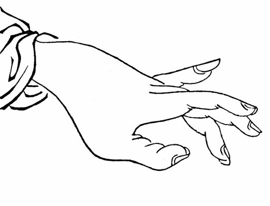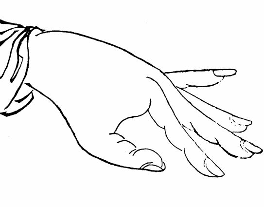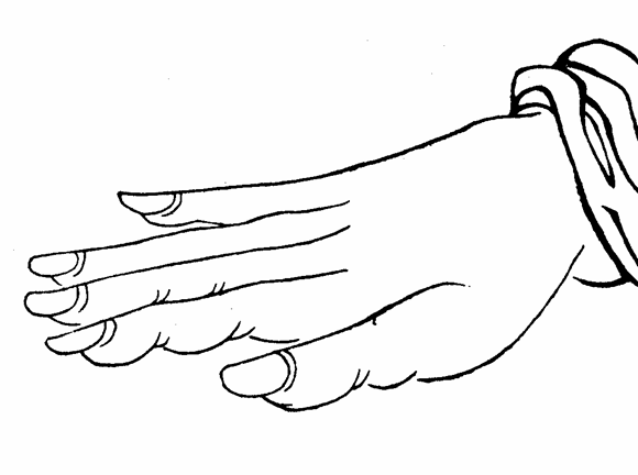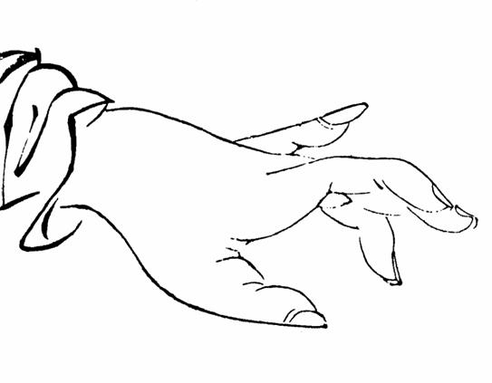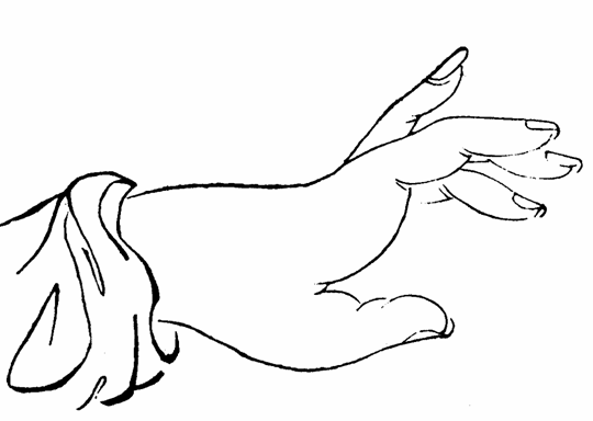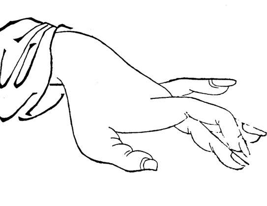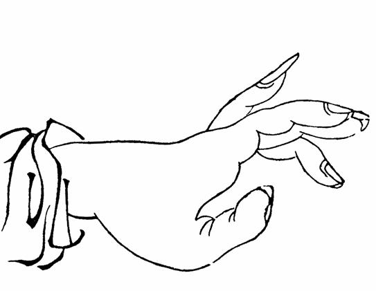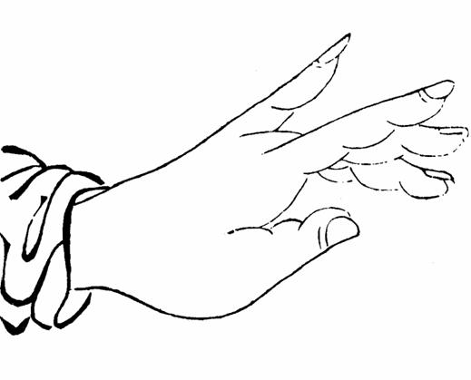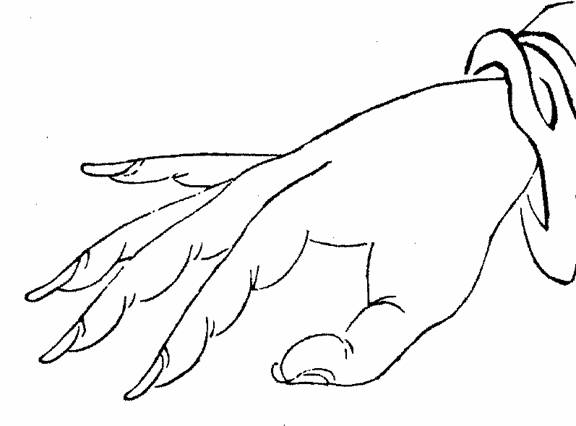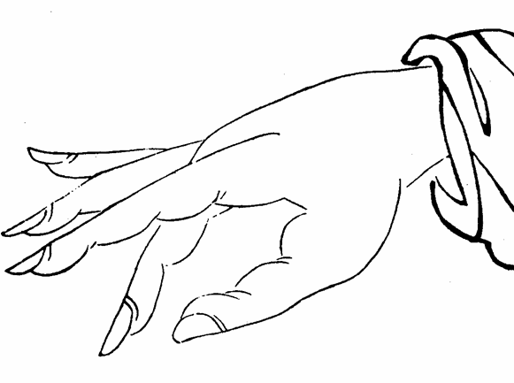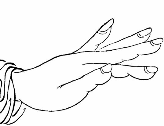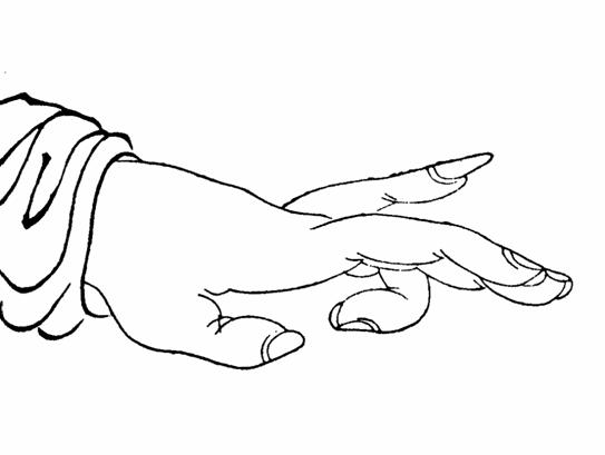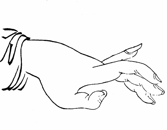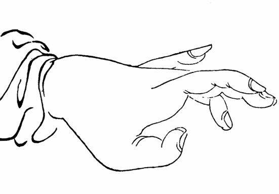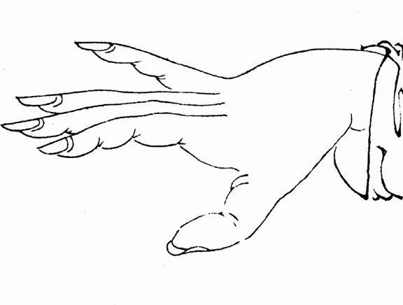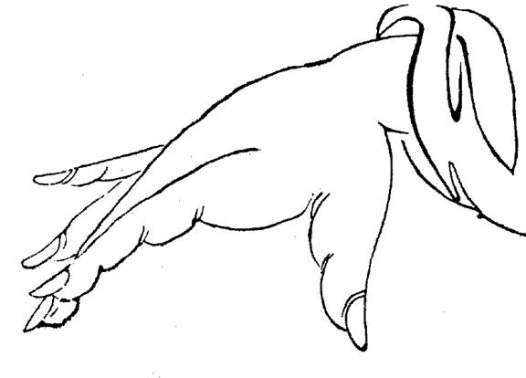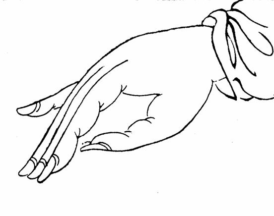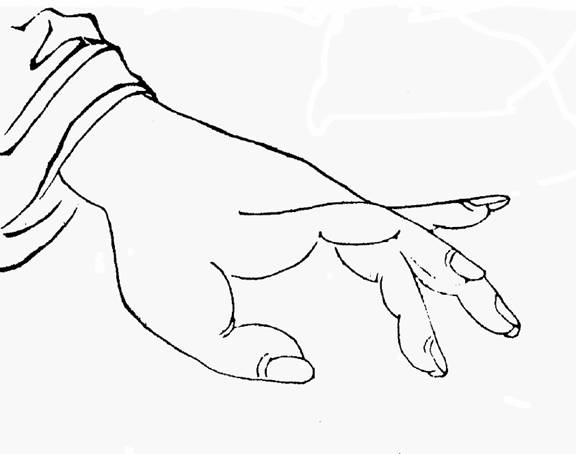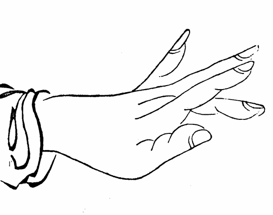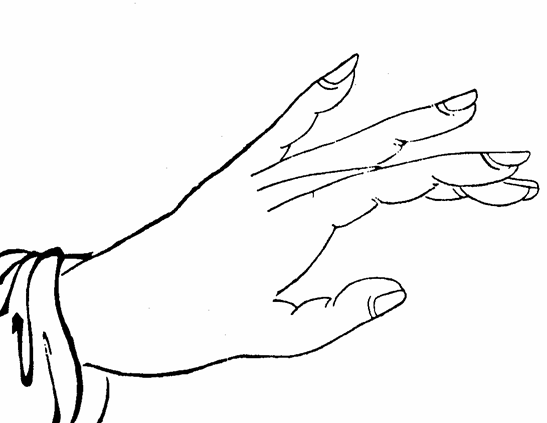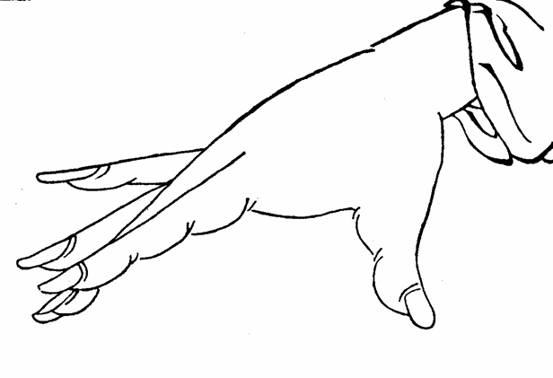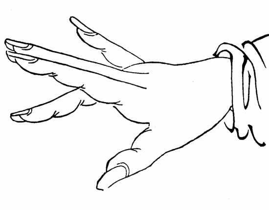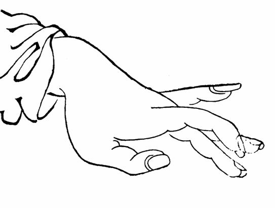 stretched out straight and is slightly to the side. The thumb is bent and at the side. The little finger is treated as in previous