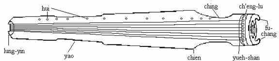 the ch'eng-lu, extending up to the bridge, where they hold the strings. The