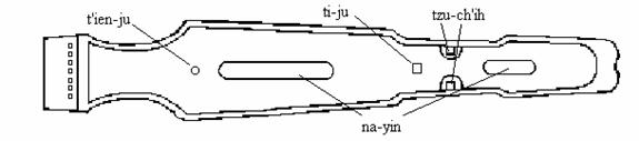 [tian-zhu] 天柱 Heaven’s pillar. One of two “pillars” used inside the ch’in,
