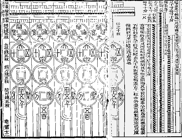 Figure 1: Two figures, although on separate pages in the original, are overlapped here. In terms of grains, we have at the right side, horizontal, vertical, and diagonal millet grains. In terms of coins, on the left from top to bottom are the K'ai-yuan, Ta-ch'ien, ch'i-tao and I-tao coins. Horizontal millet is at the top of the coins. We can also see that a Kai-yuan coin is the size of 8 horizontal millet grains, or 10 vertical millet grains.