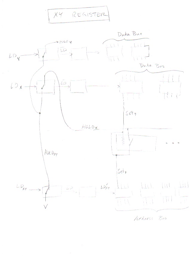 The control circuit also contains a 3 bit register called the Condition Code register. The Condition Code register is controlled by a line named LD-COND and loaded from the CY, Data7=Sign, and Z lines from the ALU. The outputs of this register are named "CY=0", "S=1", "Z=0", and "Z=1" and are used by the instruction decoding. I didn't need to put the abstract circuit for this register down on paper, but the last wiring diagram does show it.