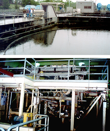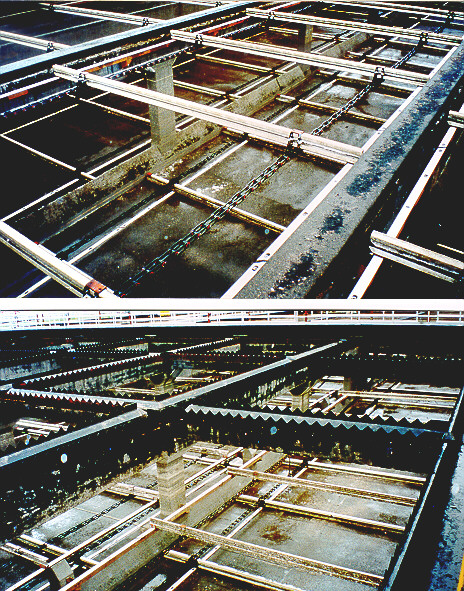 These are the original primary clarifires, not presently in use. Top: Chain-driven scum and sediment collecting squeegees.