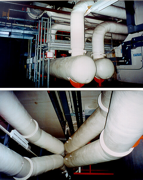 Large (3-ft) diameter pipes cary air from blowers to aeration basins via a long pipe gallery below the basins. |