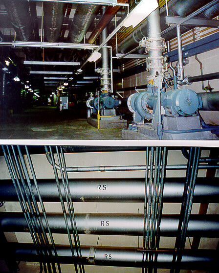 Pipe gallery below basins showing the sludge pumps and return-sludge pipes that recycle activated sludege from the secondary clarifiers to the aeration basins. |