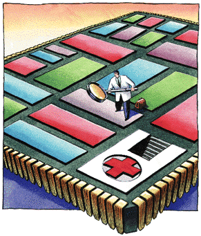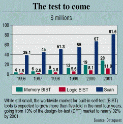 Semiconductor makers eye built-in self-test to handle complex circuits By Robert Ristelhueber (Illustration by David Chen) There's no doubt that many semiconductor makers today are capable of producing a system on a chip. But can they also reliably and affordably test it? Concerns about that are sparking interest in built-in self-test (BIST), an approach in which a chip largely performs the test functions itself. The problem of test has grown as integrated circuits (ICs) have become faster and more complex. High-speed testers cost millions of dollars, and physical access to internal circuitry becomes tougher as the number of I/O pins fails to grow as quickly as the logic content. The advent of system-on-a-chip designs has compounded the difficulty. These devices may contain embedded memories and intellectual property (IP) acquired from a variety of vendors, who often provide sketchy details about the designs of these cores, complicating the test procedure. Several electronic design automation (EDA) companies are pushing BIST as a solution. With this technique, the tester functionality is embedded as a controller on the IC during the chip's design phase. A low-cost external tester signals this controller to generate random test patterns, and then later reads the results.